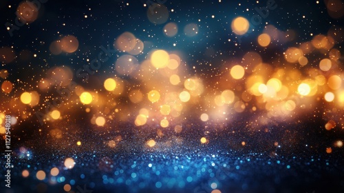 Abstract dark blue and gold bokeh glitter background.