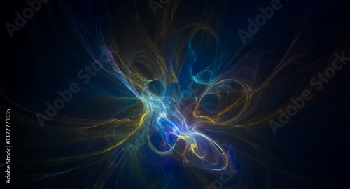 Abstract digital art with glowing, swirling light trails in blue, yellow, and white against a dark backdrop, creating a dynamic and ethereal effect.