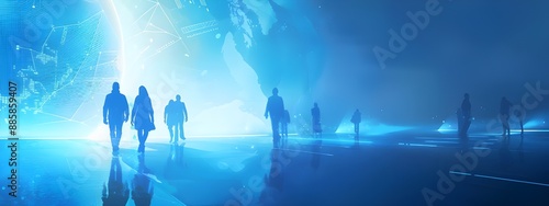 Abstract digital blue background with silhouettes of people in business attire and a globe, representing a global network technology for corporate communication or social media marketing.