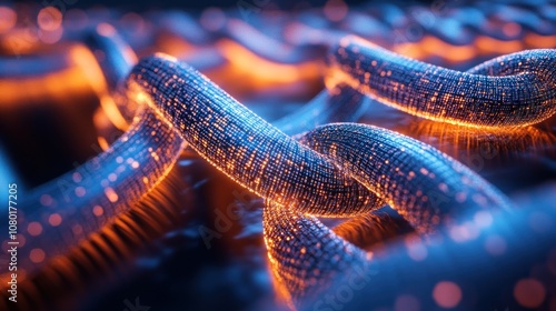 Abstract digital DNA helix glowing with orange and blue light.
