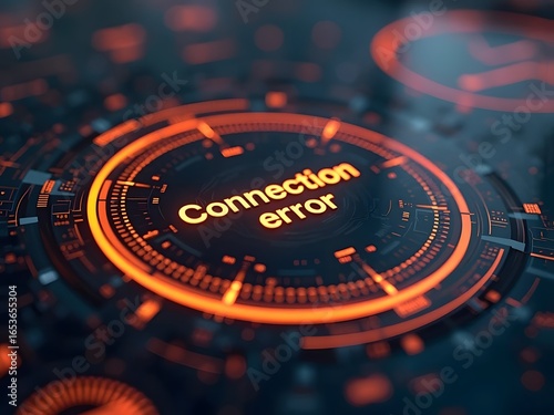 Abstract digital interface displays a connection error message, horizontal composition. Intense orange glows illuminate the futuristic technological design, creating a visually striking composition.