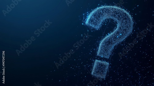 Abstract digital Question mark. Futuristic low poly wireframe Ask symbol. Support, Help, and Problem symbols on blue technology background. Polygonal illustration consist of lines and connected dots.