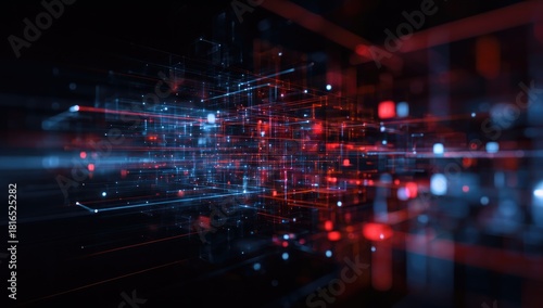Abstract digital representation of data, featuring interconnected lines and luminous blocks