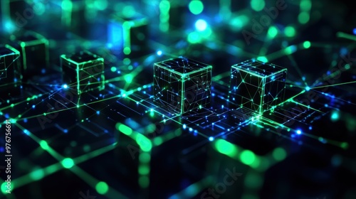 Abstract digital technology background with glowing green and blue lights, representing data flow and connectivity.