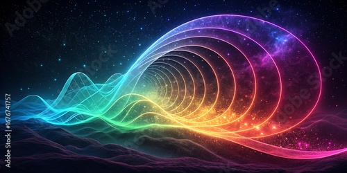 Abstract futuristic background with rainbow neon concentric waves on a dark space-like backdrop illustrations