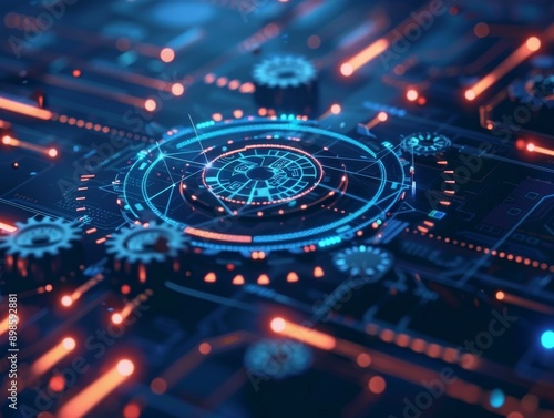 Abstract futuristic technology background with glowing blue and orange lights, gears and circuits.