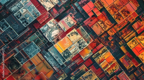 Abstract geometric pattern with colorful rectangles and squares in a mosaic-like composition, perfect for backgrounds and artistic designs.