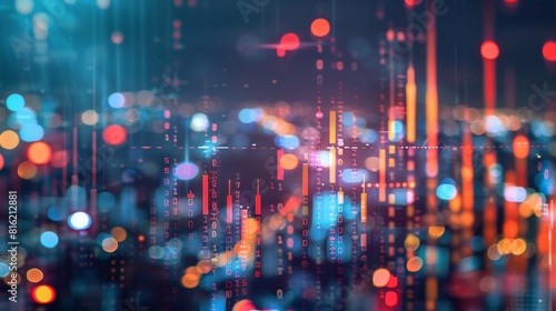 Abstract glowing big data forex candlestick chart on blurry city backdrop. Trade, technology, investment and analysis concept. Double exposure
