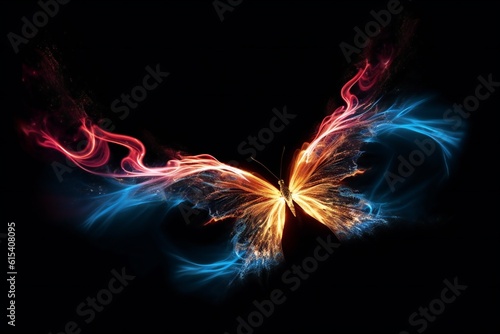 Abstract glowing fiery butterfly flying on black background and leaving red and blue fire trail behind Generative AI