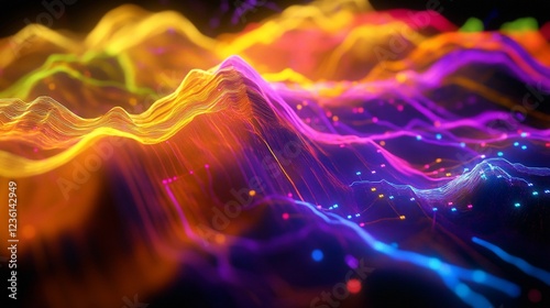 Abstract glowing lines wave forms with digital data points and connections 3D render