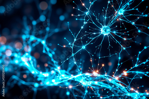 Abstract glowing network of blue and orange lines resembling neurons. It depicts complex connections and data flow, suggesting interconnectedness in a digital system.