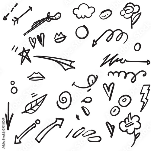 Abstract handdrawn arrows, ribbons and other elements in hand drawn style for concept design vector