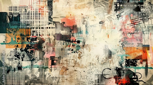 Abstract hand-drawn elements and fragmented patterns on a textured Dadaism backdrop