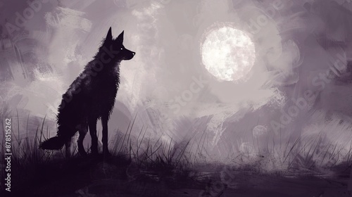Abstract illustration of a dog in a celestial landscape using soft lavender and silver tones with gentle dreamy textures