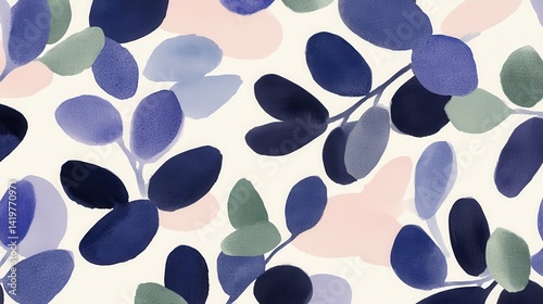 Abstract indigo eucalyptus design on white modern muted leaves pattern