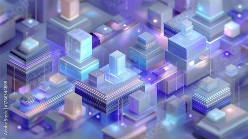 Abstract Isometric Composition of Geometric Shapes in Pastel Hues with Light Streaks Overhead View