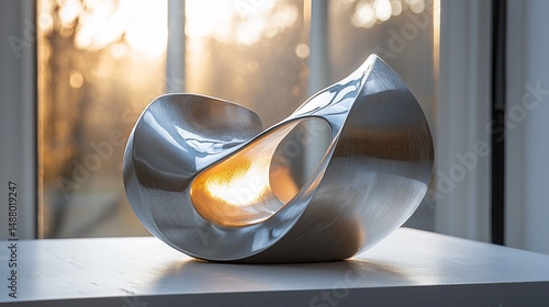 Abstract metal sculpture, warm light, contemporary art