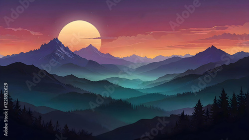 Abstract mountain landscape with a sunrise and smooth gradients. A tranquil scene of towering mountains, bathed in the soft glow of a setting sun. A moment of peace.
