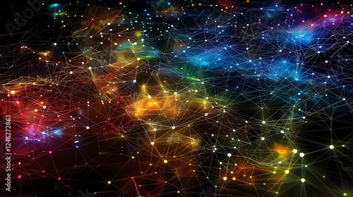 Abstract network of colorful lines and dots on a dark background. Represents connection, data flow, and vibrant digital communication.