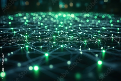 Abstract network of glowing green dots and lines connecting on a dark background.