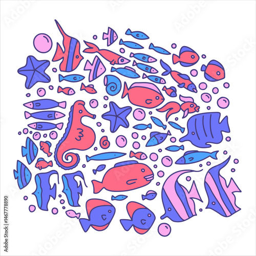 Abstract ocean fish in vintage doodle design. Vector contour color illustration