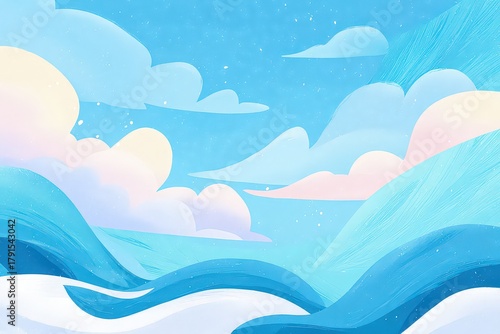 Abstract Pastel Landscape Featuring Rolling Hills and Floating Clouds Under a Blue Sky