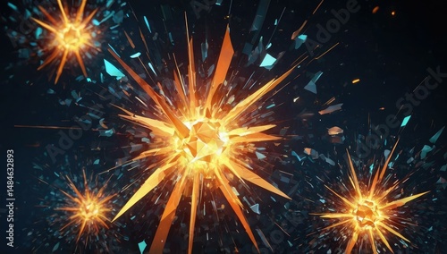 Abstract polygonal shards exploding with light, digital art, sci-fi theme