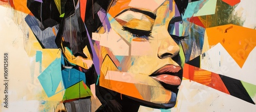 Abstract portrait of a woman with her eyes closed, painted with bold colors and geometric shapes.