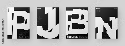 Abstract Poster Design Set. Vertical A4 format. Modernism brochure kit. Refraction and Distortion Glass Effect. Chopped, cut, glitch, broken letter composition.