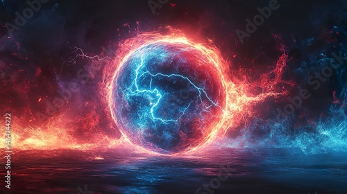 Abstract red and blue energy sphere with lightning bolts on dark background, symbolizing duality