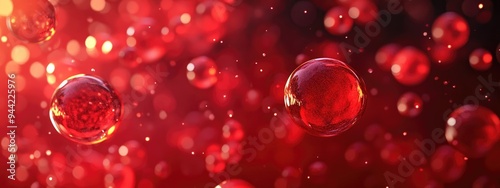Abstract red background featuring scintillating circles and glosses in a 3D cartoon rendering style