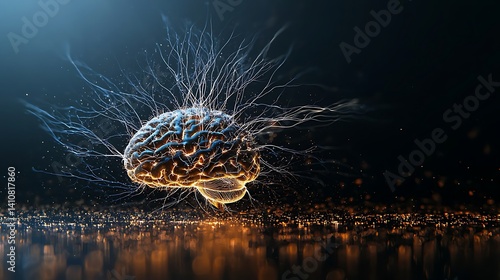 Abstract representation of a brain with electric sparks set against a dark, shimmering background