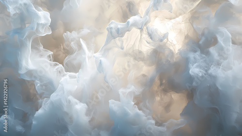Abstract shapes of white smoke coalesce and break apart, creating an ephemeral pattern, white smoke, ethereal, coalesce. Ethereal Break. Illustration