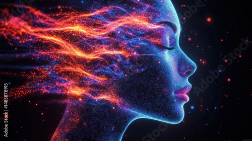 Abstract side profile of a serene human face illuminated with blue particles and flowing fiery orange lines extending from the head representing energy or thoughts