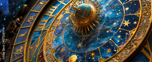 Abstract space with Zodiac signs and old golden clock, view of Astrological wheel against stars. Concept of astrology, art, design, horoscope