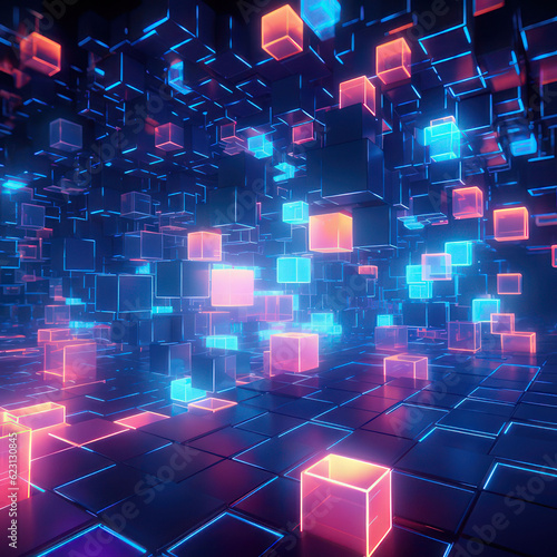 Abstract square background, neon glowing cubes. AI generative.
