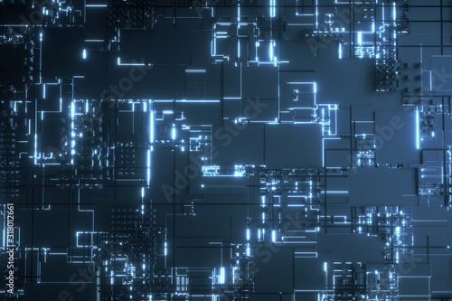 Abstract technology black background. Futuristic digital motherboard texture. Neon blue light