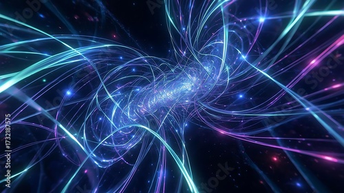Abstract visualization of swirling blue and purple energy streams in a dark cosmic void.