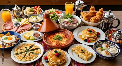 Abundant moroccan breakfast spread with tagine pancakes croissants and fresh juices