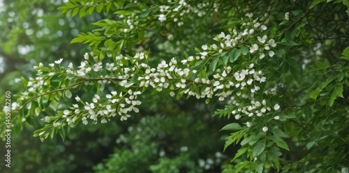 Abundant tiny white flowers adorn a slender branch, surrounded by rich green leaves , botanical image, fresh, spring