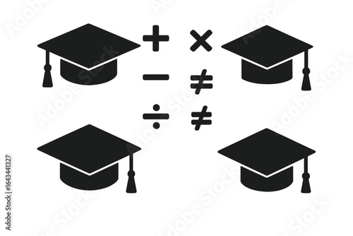 Academic success concept. Graduation cap icon set with math symbols. Education and science theme. School, university, knowledge, learning vector graphic. Arithmetic signs.