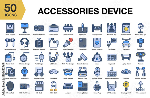 Accessories Device flat icon set. Includes accessories, device, gadget, tech, electronics, and More. Flat icons vector collection.