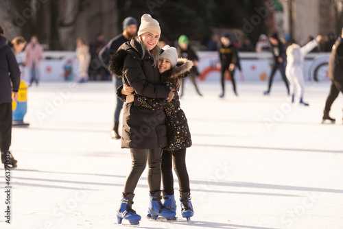 Action shot of beautiful woman teaching her daughter how to ice skate