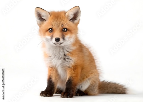 Adorable baby red fox with fluffy fur sitting on a clean white background looking directly at the camera
