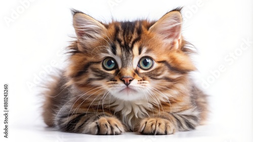 Adorable ball of fluffy fur with bright curious eyes and twitching whiskers, playful kitten isolated on a pure white background.