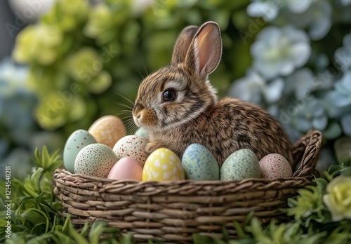 Adorable Brown Bunny Sitting Among Colorful Easter Eggs in a Natural Decorated Setting Surrounded by Greenery and Floral Arrangements for Spring Festivities
