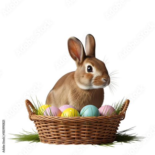 Adorable bunny in a wicker basket with colorful easter eggs isolated on transparent background