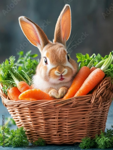 Adorable Bunny in Carrot Basket - Cute bunny rabbit nestled in a wicker basket overflowing with fresh carrots. Symbolizing spring, harvest, abundance, cuteness, and springtime joy