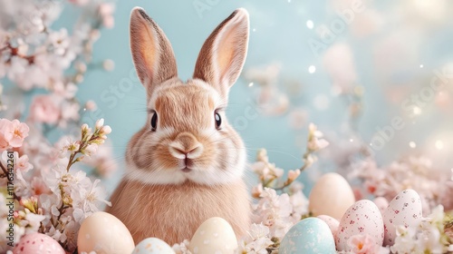 Adorable bunny nestled in spring blossoms and pastel Easter eggs.