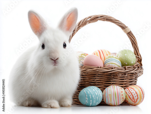 Adorable Bunny with Decorated Easter Eggs on White / 하얀 배경 위 장식 달걀과 귀여운 토끼